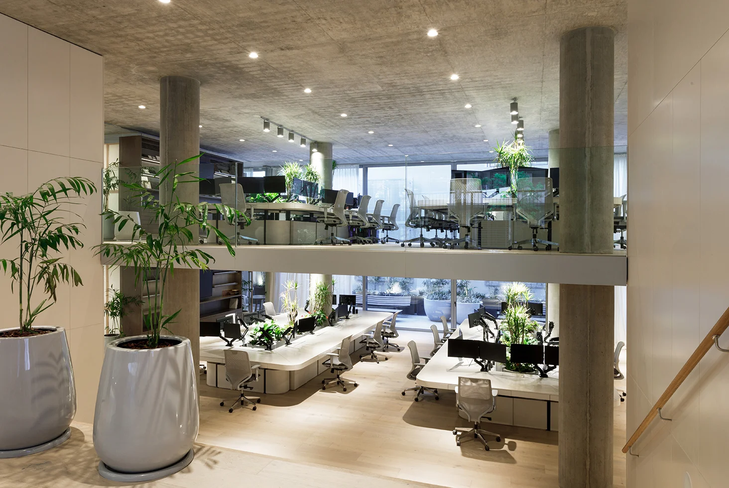 Corporate Azcuy Offices interior featuring open-plan workspace, modern furniture, and natural lighting.