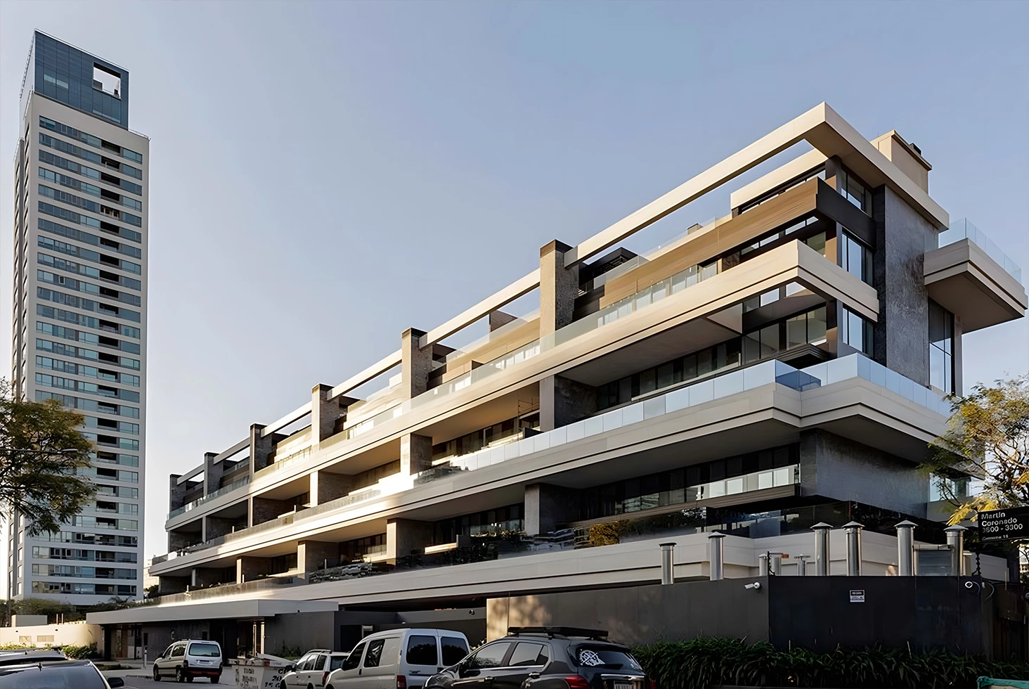 Aerial view of L Avenue Zaha Hadid Multi-Residential tower rising above the Buenos Aires skyline.